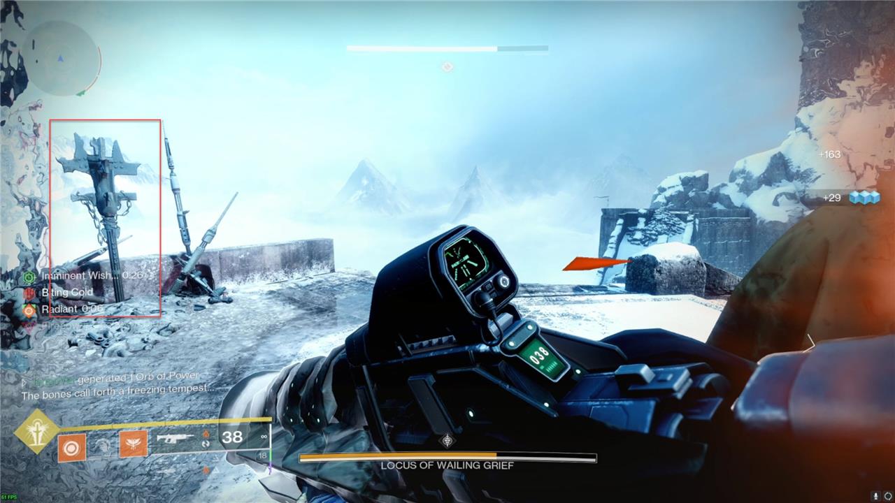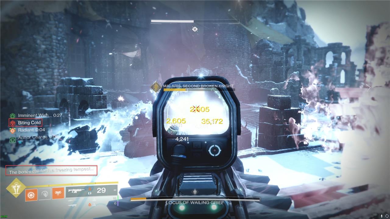 “The bones call forth a freezing tempest” will appear in the combat log when this starts. This storm will start to give you stacks of the “Biting Cold” debuff. If those stacks reach 10, you’ll die. This will go away once the Imminent Wish timer runs out.