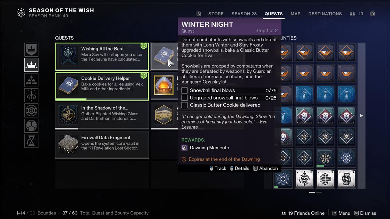 The “Winter Night” quest in Destiny 2 is part of The Dawning event and tasks players with completing three main objectives to earn The Dawning Memento. First, players must get 75 Snowball final blows and 25 upgraded Snowball final blows, which require unlocking upgrades from Eva Levante using Dawning Spirit currency. Snowballs drop randomly from defeated enemies, and upgraded snowballs have enhanced effects. Finally, players need to deliver a Classic Butter Cookie to Eva. These steps can be done in any order, but farming snowball kills is easier in areas with many enemies, such as the Moon’s Sorrow’s Harbor or Neomuna’s Terminal Overload activity. After completing these tasks, players receive The Dawning Memento, which can be inserted into a weapon at the Enclave to unlock a unique shader by leveling the weapon to 30. Additional Mementos can be earned by opening Gifts in Return, obtained through cookie deliveries to NPCs during the event.