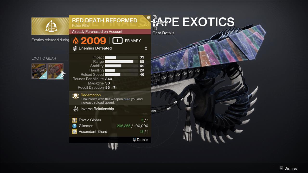 If you’re looking for Exotic weapons you don’t own – which are typically more interesting and worth grabbing than armor – take your Exotic Ciphers, a massive amount of Glimmer (between 100,000-125,000), and the occasional Ascendant Shard to the Monument to Lost Lights, which is near the Vaults. Here, you’ll be able to exchange your currencies for any Exotic weapon that is from a retired piece of content and no longer available to get via traditional means. This includes old season pass Exotics and Exotics whose quests have expired. You can even pick up Exotics from old raids that are no longer in the game, although you’ll also need a whopping 240 Spoils of Conquest on top of your Exotic Cipher to get those.