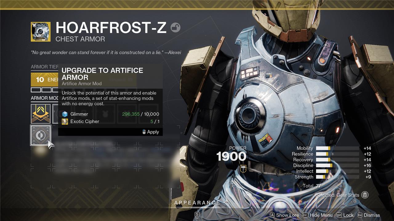 Second, you can spend your Exotic Ciphers to upgrade your Exotic armor pieces into Artifice Exotic armor. This causes your Exotic armor piece to function just like a piece of Artifice armor that you can get from Master Dungeons, and allows you to slot a free 3 stat mod into your Exotic. This is invaluable for late-stage build-crafting, as it’s very common to be just three little stats away from a breakpoint. Just remember that Exotic Ciphers are very rare, and this process can’t be undone, so make sure to only use the Artifice Unlock slot on well-rolled Exotic armor pieces that you use frequently.