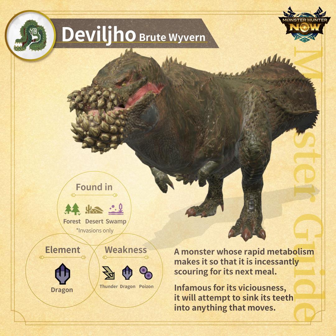 In Monster Hunter Now only select large monsters within Volatile habitats can be invaded and become a Deviljho encounter. (It similar to how Ditto in Pokémon Go is ’hidden’ behind certain creatures.) These monsters are: