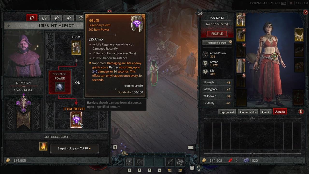 If you get a Legendary item to drop for you from a boss or chest, you can extract its power at the Occultist. Extracting will destroy the Legendary but add its Aspect to your current character’s inventory – which you can, in turn, imprint onto a new, more powerful item.