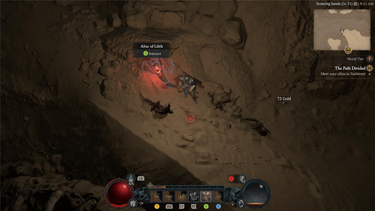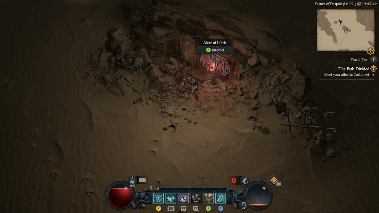 Just north of the Halls of the Damned dungeon, you’ll find an Altar of Lilith pressed into the sand and leaning on a rock.
