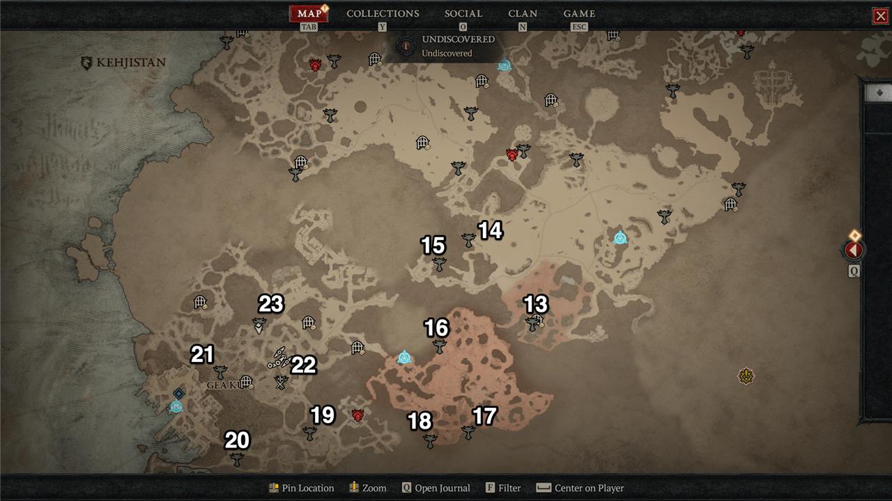 Southern Kehjistan hosts Altars of Lilith scattered across deserts, ruins, and coastal edges, each concealed near ancient structures or guarded by hostile creatures. Altars #13-23 reward players with stat bonuses and Renown once activated, helping complete the region’s progression. Keep an eye on narrow paths and forgotten shrines near key landmarks such as Caldeum and Gea Kul, as several altars lie off main routes or behind clusters of enemies.