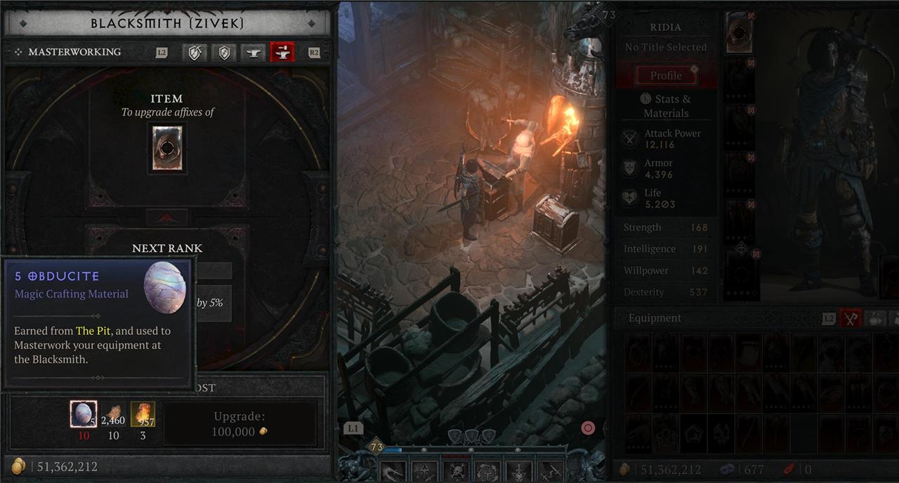 | Rank 4 | 30 Obducite; 15 Iron Chunk or Rawhide; 4 Veiled Crystal; 70,000 Gold | One affix picked randomly is upgraded by 25% |