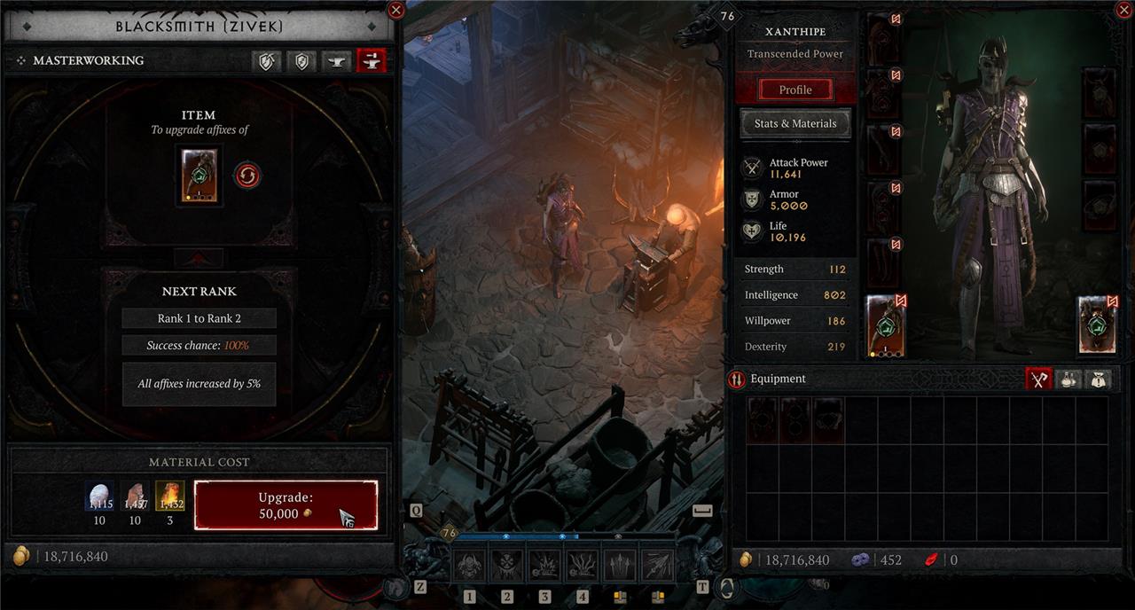 With all the materials in hand, you can hit the upgrade button. Since part of the process is random and you can’t control which affixes are upgraded in rank 4, 8 and 12, you might end up not liking the results. If this is the case, you can simply reset the Masterwork rank to zero. You don’t recover the materials spent in the process up to that point – you actually have to spend more resources and gold to reset it. On the other hand, the reset is necessary if you want to maximize the right affixes for your build.