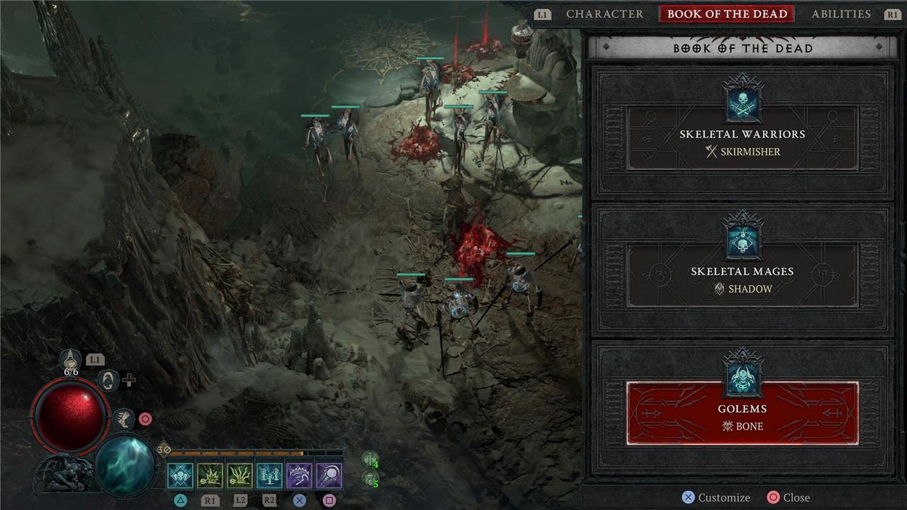 When you first start out as the Necromancer, you’ll have an extra ability on your bar, which will let you summon skeletons to fight alongside you. You can customize these minions via the Book of the Dead menu. In the Book of the Dead, however, you’ll notice that you can also, eventually, summon a golem to fight at your side.