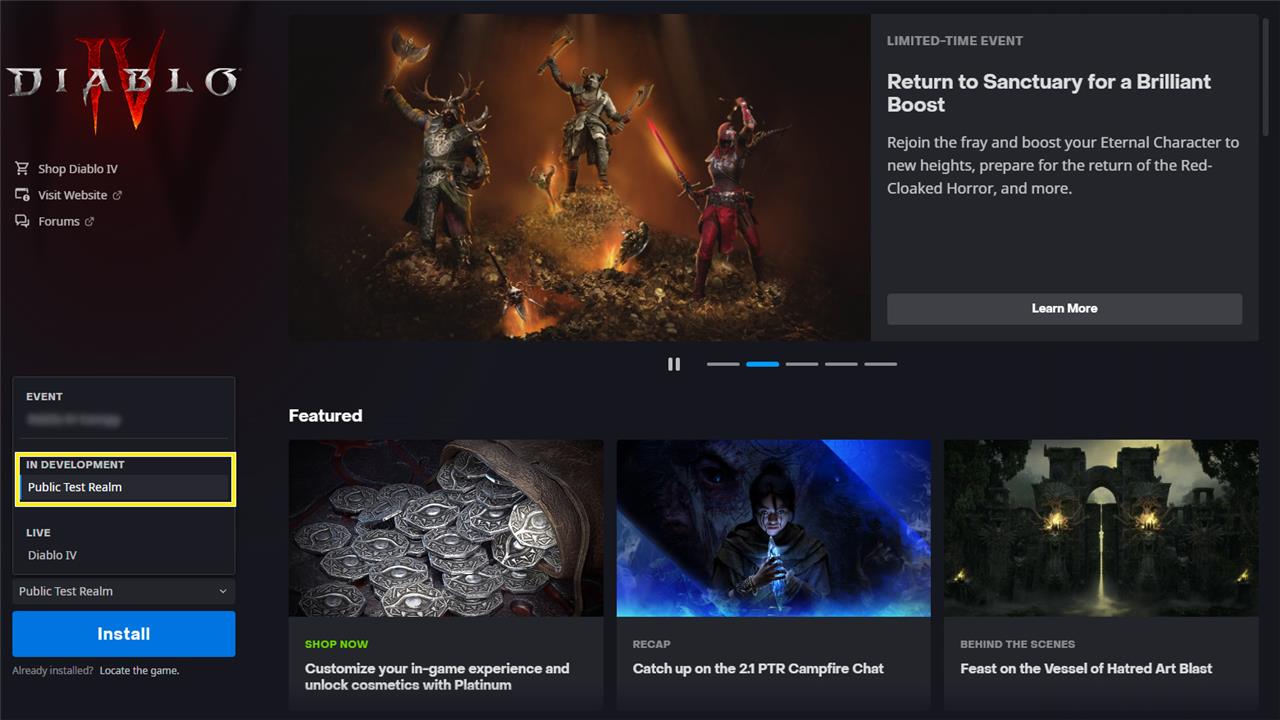 Select the PTR client in Battle.net: In the Battle.net app, select Diablo 4, then use the dropdown above the Play button to choose “Public Test Realm,” and install the PTR client.