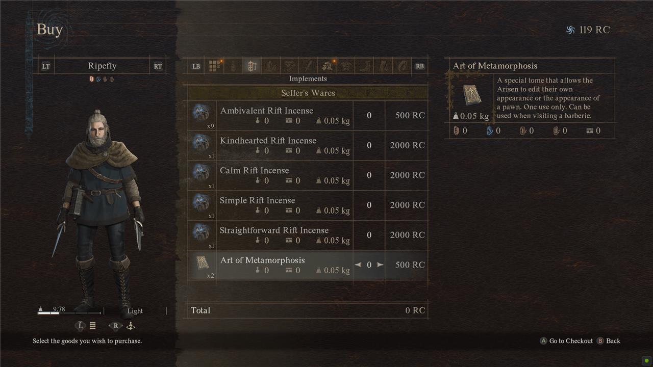 At the Pawn Guild in Vernworth, the attendant has a shop where you can buy incenses to change your main pawn’s inclination and voice. They also sell a book called the “Art of Metamorphosis” for 500 Rift Crystals (RC), though stock is limited to two total. (As of this writing, we haven’t found an addition location that sells the tome or figured out how it comes back in stock, but will update this guide when we do.)