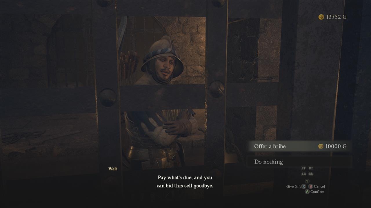 To bribe the guards and get out of gaol in Dragon’s Dogma 2, you need to wait for a guard to pass by your cell and then initiate a conversation. The guard will demand a bribe, which can be quite costly-often around half of your current gold or approximately 10,000 gold-making this method expensive as the bribe amount scales with how much money you carry. Once you pay the bribe, the guard will let you go, and you can retrieve your gear on the way out. Although this is the simplest way to escape, it is generally not recommended unless you have abundant gold, as there are other less costly escape options like using a Makeshift Gaol Key or finding a weak wall to break through.