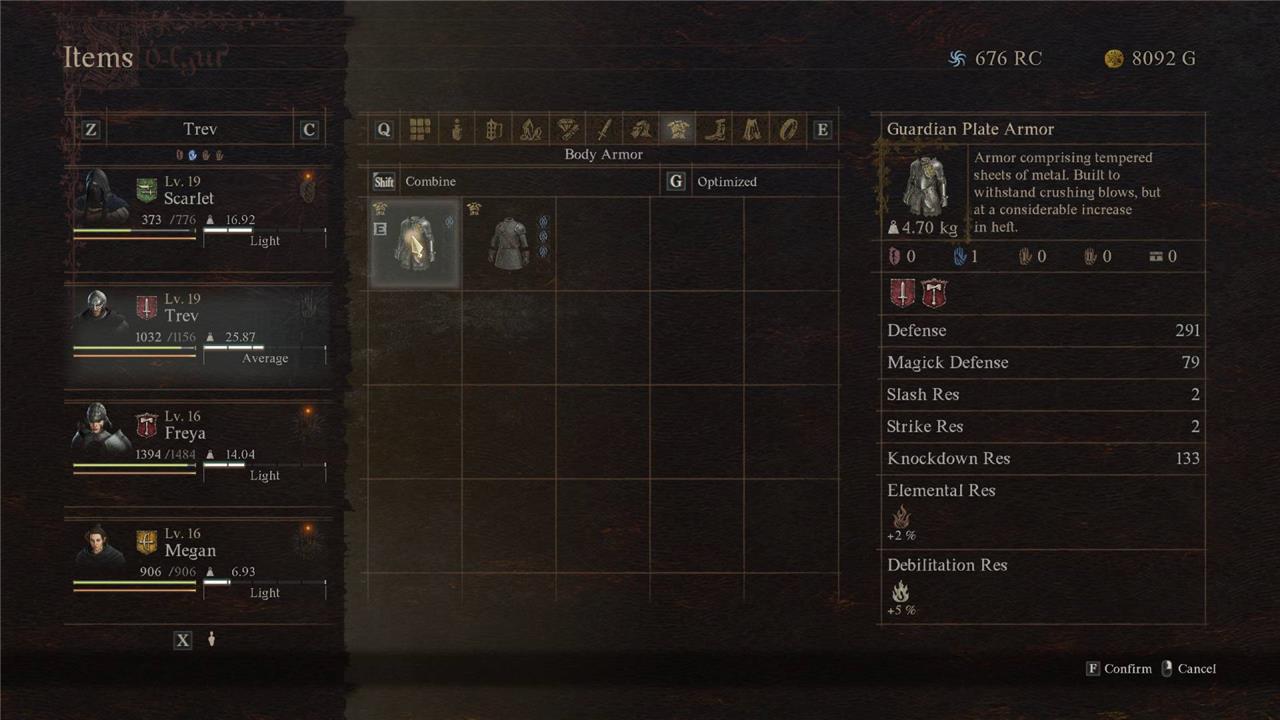 For the head, you can opt for either the Soldier’s Helm (2,250 gold) or the Iron Helm (4,400 gold). The Soldier’s Helm is lighter and cheaper, but has very slightly weaker defensive stats. Make sure you grab the Guardian Plate Armor (12,800 gold) though, as this has the best defensive and resistance stats out of any armor piece at this stage of the game. Then there’s the Guardian Leg Plates (11,550 gold) which are expensive and heavy, but worth it for the extra protection.