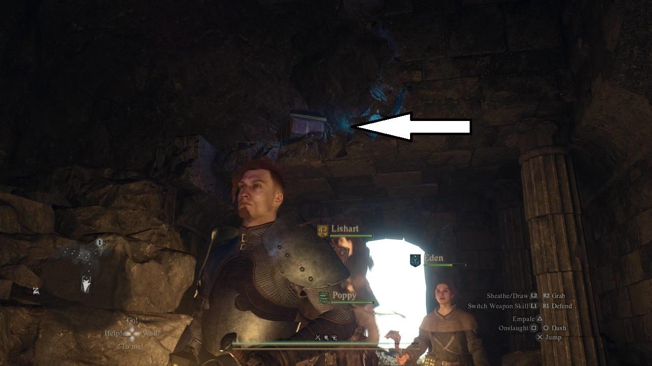 To complete the Riddle of Eyes in Dragon’s Dogma 2, enter the cave that the Sphinx points toward, take a few steps in, and look behind you. There’s a chest located above the door, next to the wall (as show in the screenshot above). Climb the rocks to get to it, grab the Sealing Phial, and return to the Sphinx. Give her the Sealing Phial to complete the riddle.