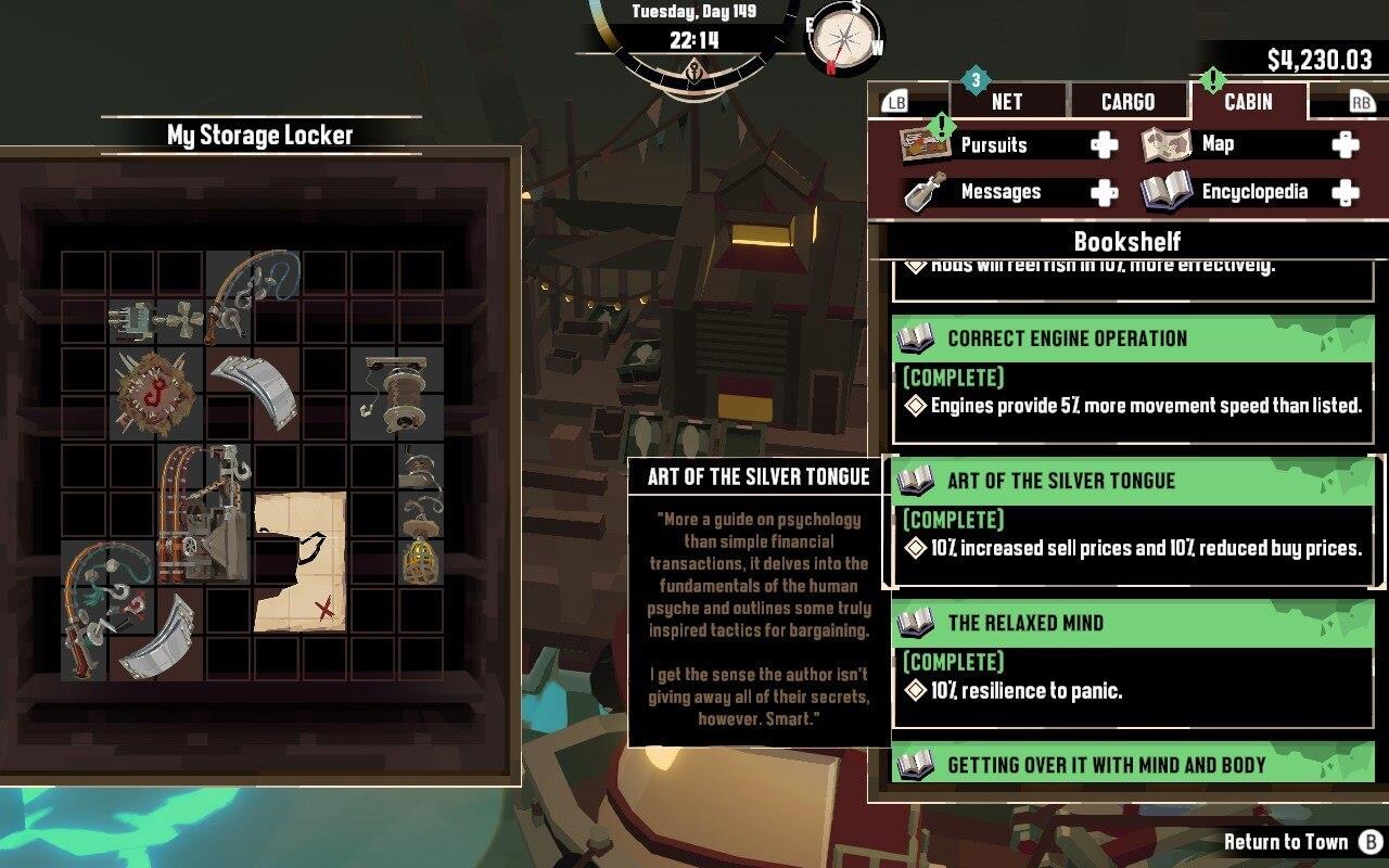 Plus, during conversation, the Traveling Merchant will offer you a book called Art of the Silver Tongue; this decreases prices on items she sells and increases prices for fish she’ll buy. Keep chatting with her and bringing her fish and things to fix to get the book, which you’ll then have to read while trawling the ocean. Regardless, go catch some fish and keep selling them to her until you’ve got the funds. The Refined Metal is located on the last tab of the Traveling Merchant’s Shipyard menu screen.