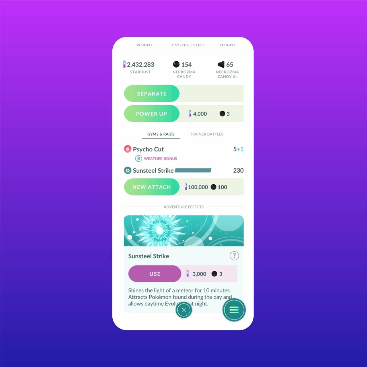 As well as fleshing out your Pokémon collection, a perk for acquiring Dusk Mane Necrozma and Dawn Wings Necrozma is they come with a unique Adventure Effect. These are Charged moves that can be used outside of battle to give you temporary bonuses.