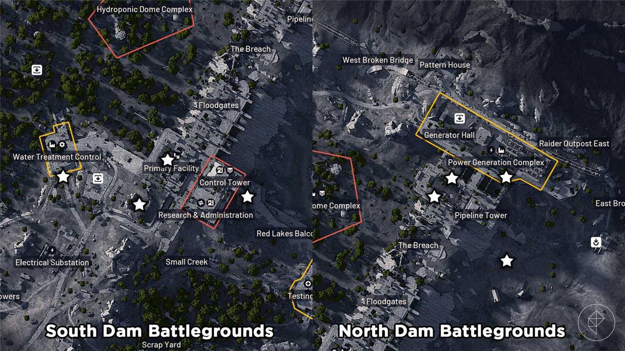 Dam Battlegrounds has a lot of call station locations, but they can be fairly spread out. As it can take a while to go from one side of the map to the other, we’ve marked possible call station locations on both the southern and northern sides of Dam Battlegrounds, which can be seen in the image below.