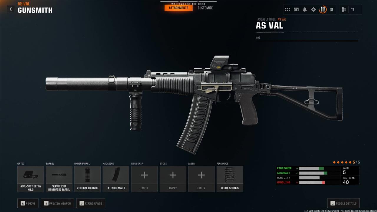 As mentioned, the AS VAL has an incredibly small magazine by default with only 20 bullets in, so we’d suggest equipping either the Extended Mag I or II. We’ve gone for the latter because the cons aren’t too severe if you’re playing slowly – debuffs to the reload, aim down sight, and sprint to fire speeds – but if you do find they hinder you too much, opt for the Extended Mag I. Finally, the Recoil Springs do what they say on the tin: buff the recoil control.