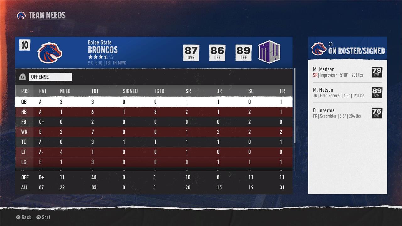 It’s entirely possible to track your roster’s shortcomings by hand, but thankfully College Football 25 doesn’t make you do that kind of work. Instead, you should spend a significant amount of your recruiting time in the Team Needs spreadsheet – which you can find by pressing the right stick while in the recruiting menu.