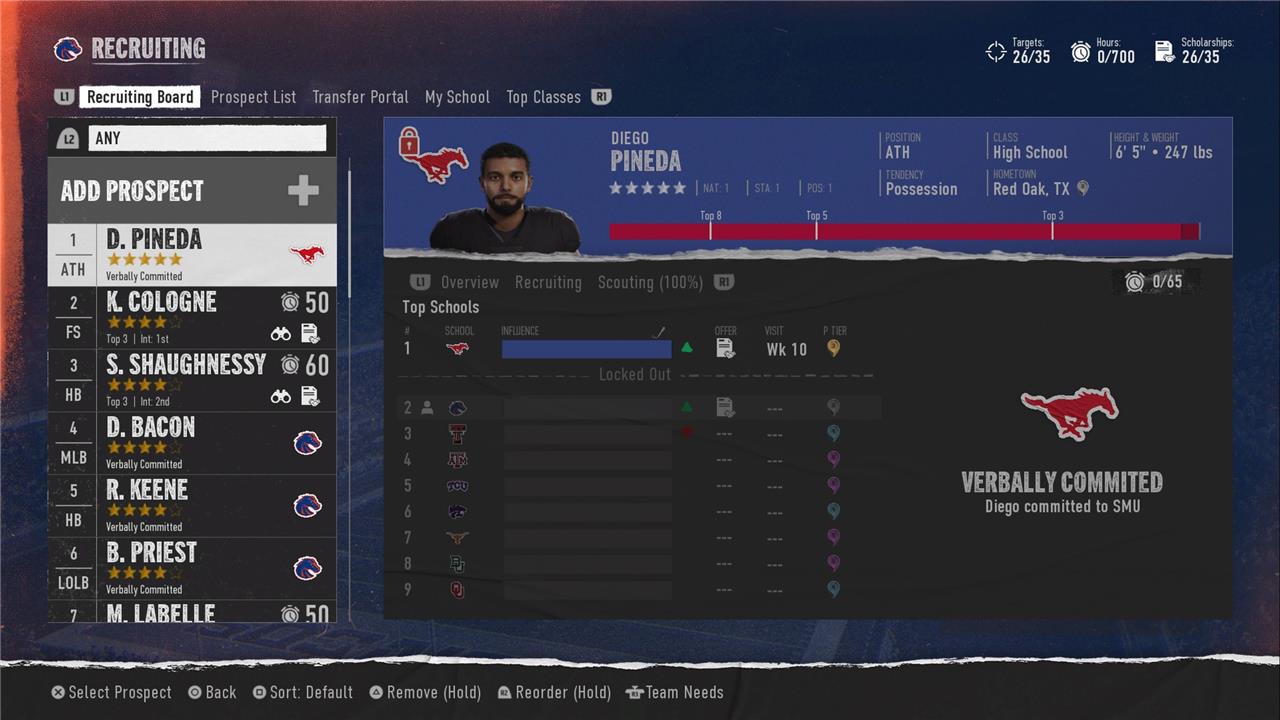 EA Sports College Football 25’s recruiting system features a recommended tab, which surfaces players the game thinks you should target. This largely shows you players that already have you in their top 10, or realistic targets in pipeline states. I find this to be an easy way to find solid recruits to fill out the rest of my class later in the recruiting cycle, but I tend to ignore it at the very beginning unless there are big time prospects that are considering my school (but I’ll likely find those anyway). –PV