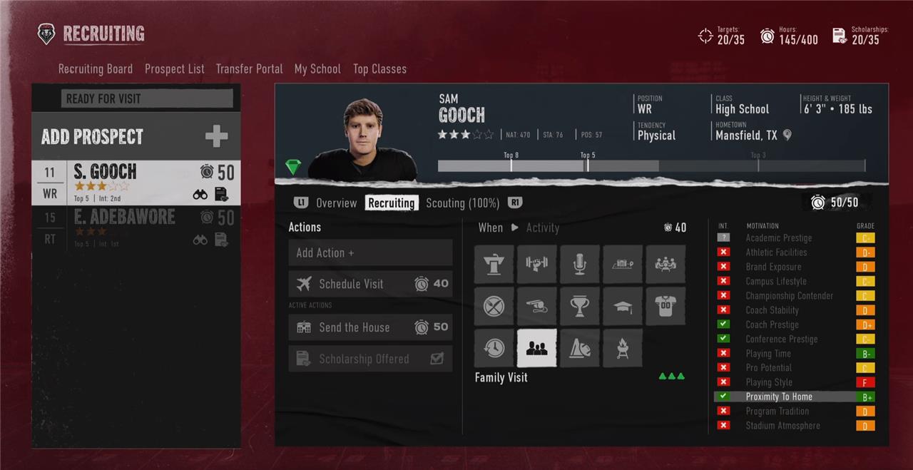 Visits are a particularly effective and important recruiting tool that becomes available after a player has listed your school in their top 5 choice. From there you can invite them to your campus for a home gameday. During their stay, you can have them focus on one element of your program. Ideally for this you’ll want to choose a category that’s important to them (has a checkmark next to it on their scouting sheet) as well as something you’re rated highly on, ideally with a B grade or higher.