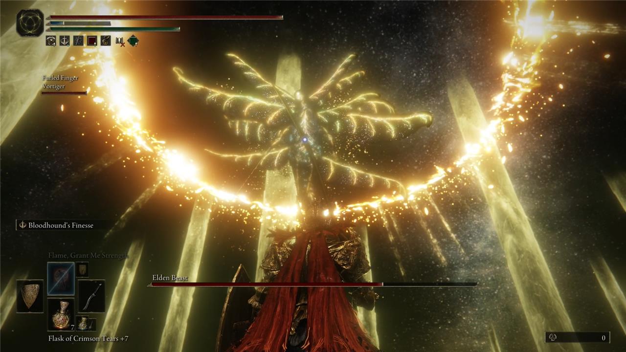 A quite dangerous spell that the boss uses is a golden star that follows you around. Alongside it, there are smaller projectiles that can also hit you. You can see the Elden Beast is about to release it when a glowing golden light appears in their left hand. Although dealing with the following star is not a problem in itself, it becomes troublesome when you need to pay attention to whatever else the boss is doing. A good way to escape the star is by taking some distance and rolling towards the direction it’s coming. Eventually, the spell stops and you can stop worrying about it.