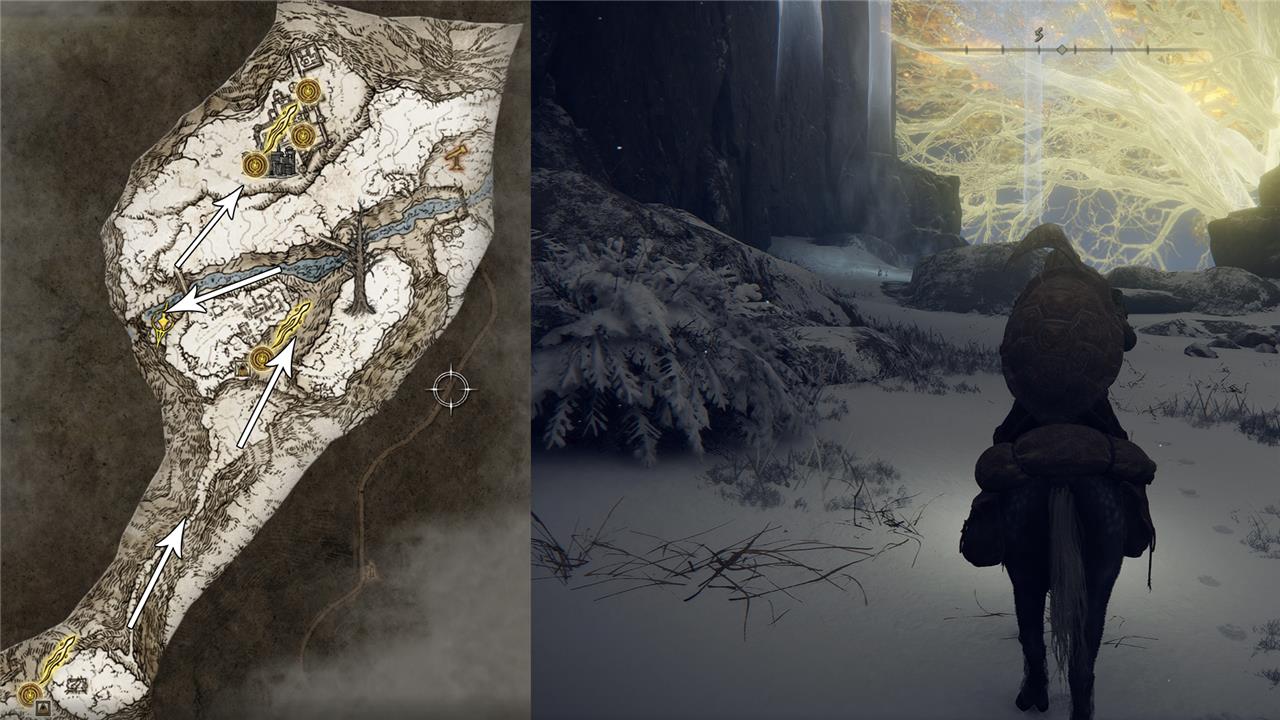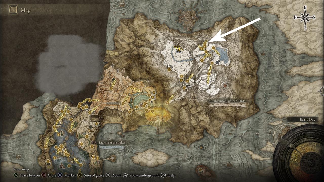 The left half of the Secret Medallion is found in the Mountaintops of the Giants region. Beware that this is an endgame region for Elden Ring, so you’ll need to fight through all of Liurnia, Altus Plateau, and Leyndell Castle before you can grab it. Here’s where to find this Haligtree Secret Medallion location on the map: