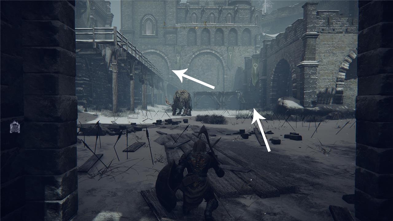 Go upstairs, then cross the square outside. Defeat the two spectral warriors guarding the square, and watch out for the crossbowman up the wall on the other side. It’s easiest to lure the warriors towards the room and defeat them there, then evade the crossbow bolts as you run across the square.