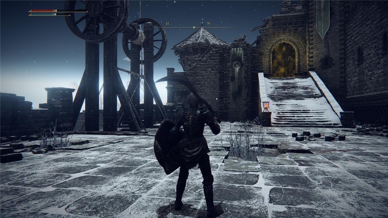 Four spectral warriors will spawn on the staircase, joined by a spectral knight when you reach the top. If you want to save your strength, you can fight the normal warriors but dash past the knight, straight to the boss arena gateway in front of you.