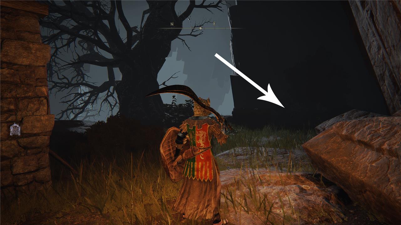 At last, you’ve reached the Secret Medallion location. If you follow the path just a bit further, you’ll see a dark corner on your right, with a small stone tomb in front and a large tree on the left. In this dark corner, as pointed out by the arrow, there’s a large pot – this is Old Albus in disguise. Hit the pot once to reveal Old Albus and exhaust his dialogue, after which he’ll hand you the Haligtree Secret Medallion (Right).