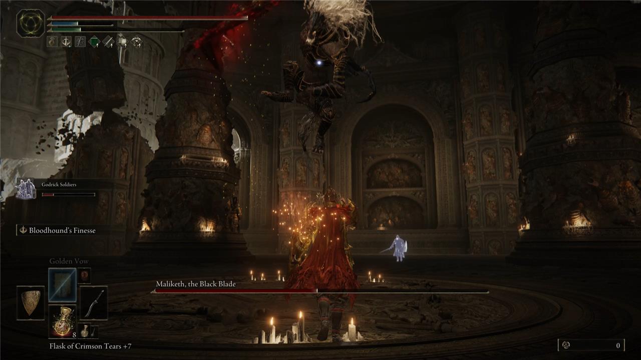 Utilize Pillars for Cover: The arena’s pillars can block Maliketh’s ranged aerial slashes and give you safe spots to heal, buff, or reapply buffs during the fight.