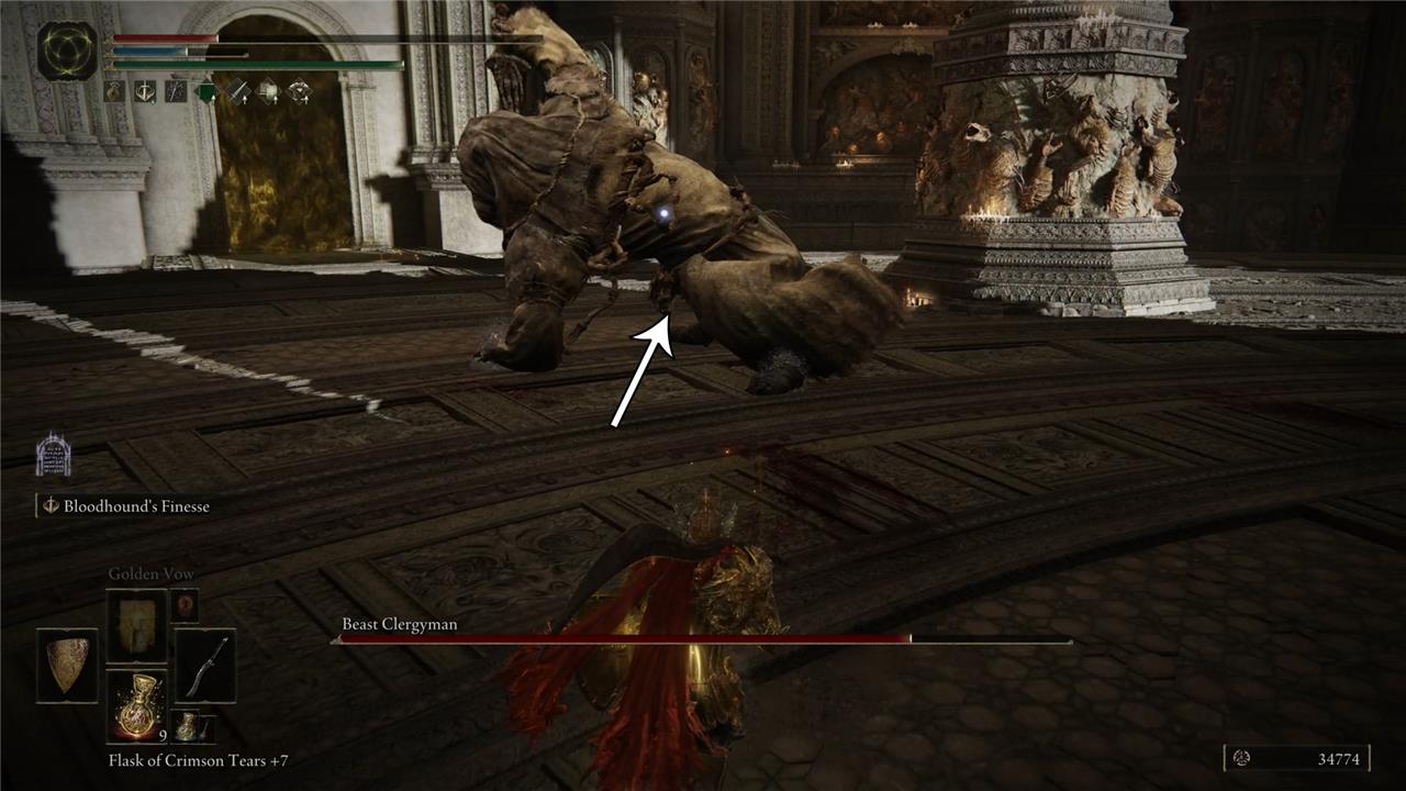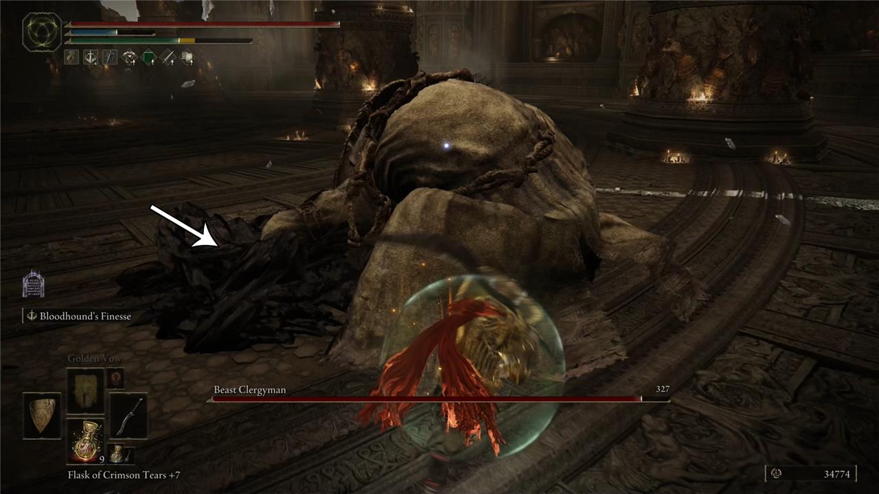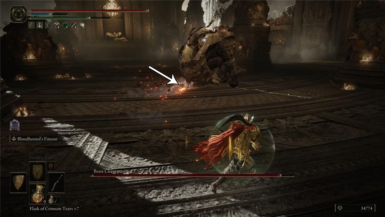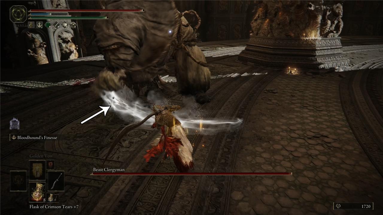 In one particular sweep attack, Maliketh sticks the knife on the ground and rotates from right to left. Taking some distance will prevent you from getting hit by his attack. However, this is a great moment to attack him. So, try to get closer to Maliketh and roll – or run – toward the direction indicated in the image below. This is a safe spot from where you can hit him once or twice.
