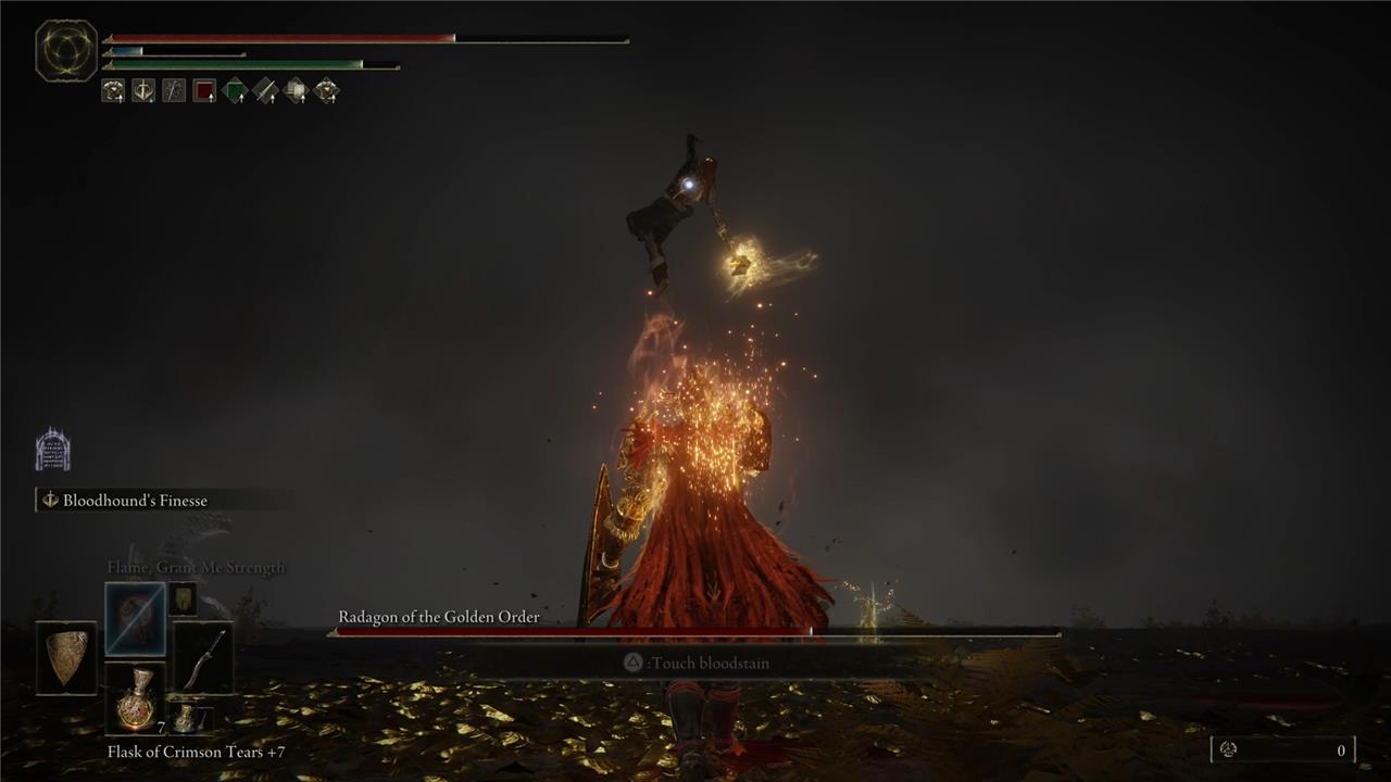 While physical damage works just fine against Radagon, detrimental effects such as poison and bleeding don’t do much in this fight. On the other hand, Radagon has no resistance against fire damage. Weapons like the Godslayer’s Greatsword or the Blasphemous Blade are great against him. Black Flame spells work fantastically too.