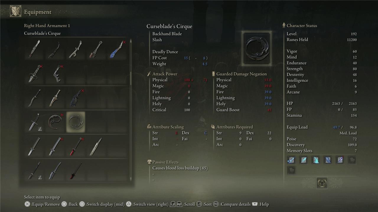 Curseblade’s Cirque can be found in the Shadow of the Erdtree DLC of Elden Ring. The weapon drops from Masked Curseblade enemies, with the most reliable farming locations being near the Gravesite Plain Site of Grace and the Stagefront Site of Grace in Belurat, Tower Settlement. The latter is located just before the Divine Beast Dancing Lion boss arena; from the site of grace, turn around and descend the stairs to find a wandering Masked Curseblade. Defeating these enemies offers a chance to obtain the Curseblade’s Cirque, and players are advised to boost their item discovery rate using items like the Silver-Pickled Fowl Foot and the Silver Scarab talisman to increase drop chances.