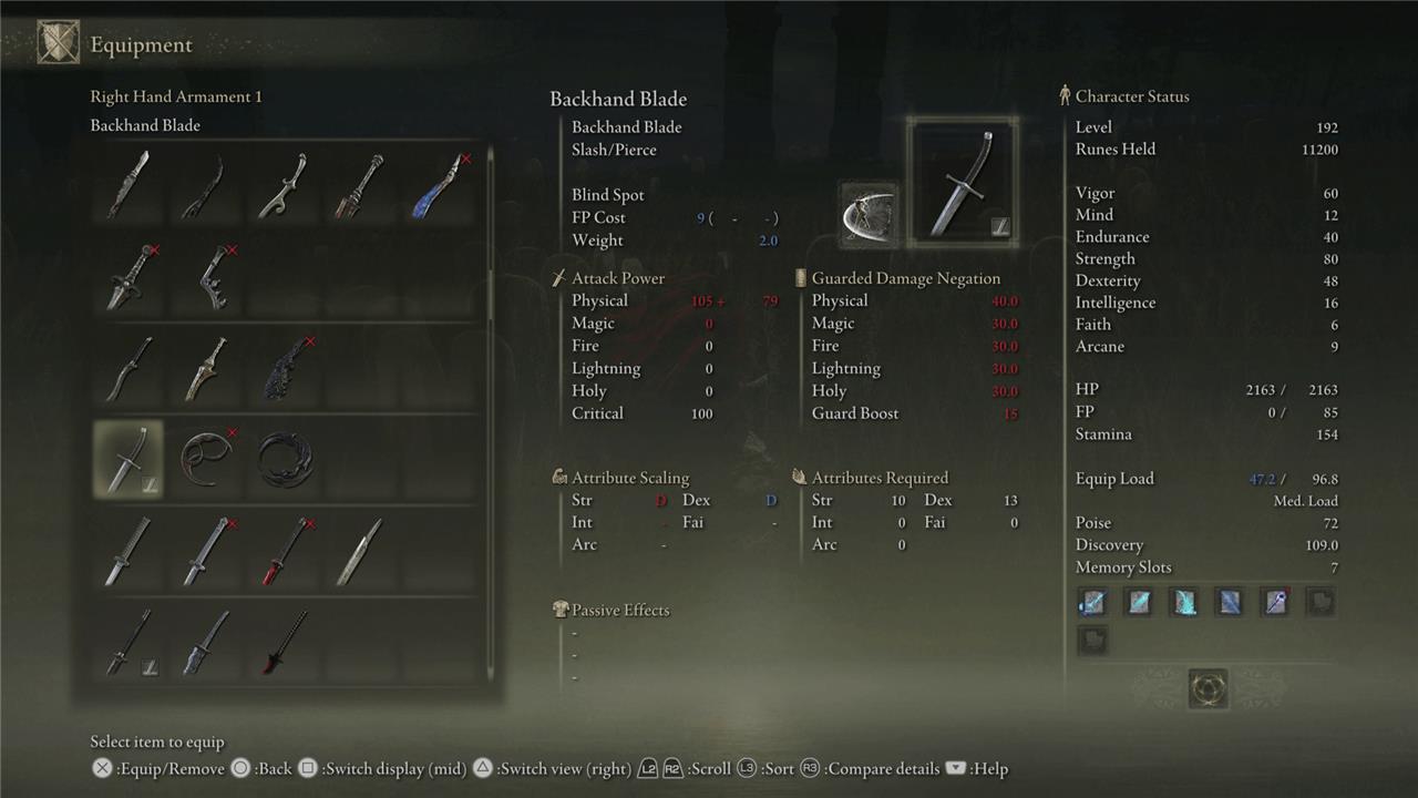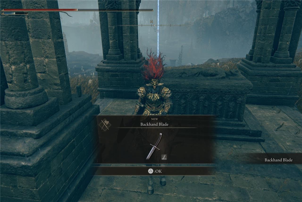 Backhand Blade: Found in the center of Gravesite Plain, northeast of the Scorched Ruins. It lies inside a stone mausoleum on a corpse next to a sarcophagus, near eight spiral-patterned stone pillars. The area is patrolled by cloaked enemies and a Furnace Golem, so caution is advised.