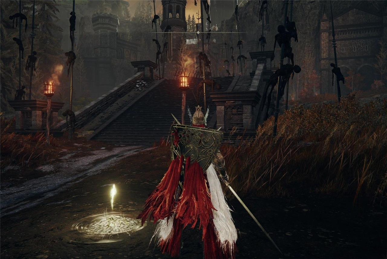 From the Castle Front Site of Grace, head south and descend into the poison swamp area, keeping an eye out for the large, prominent dead tree.
