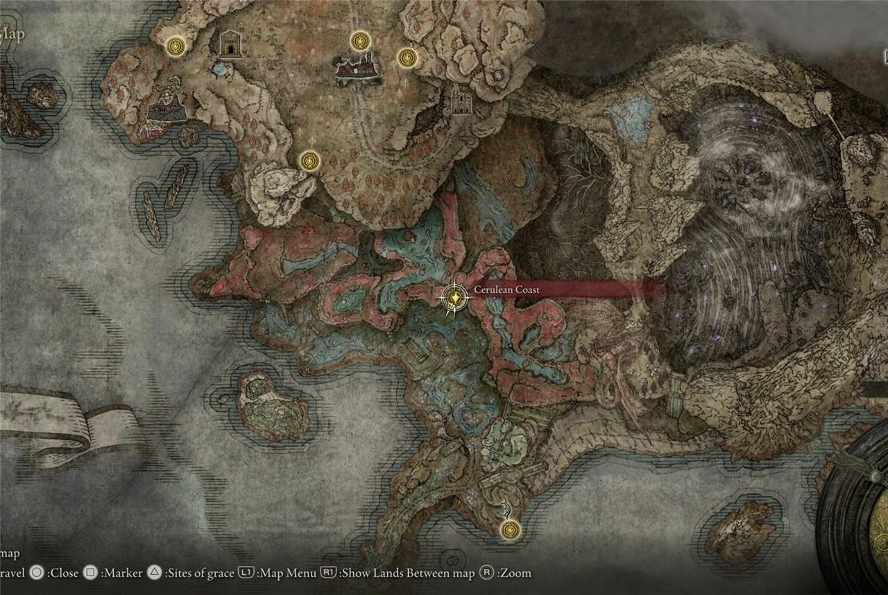 To start your journey to the Cerulean Coast, start from the front of Castle Ensis. Specifically, we recommend the Castle Front Site of Grace, which is found just past a bridge after meeting various NPCs for the first time at the crossroads in the starting Gravesite Plain area.