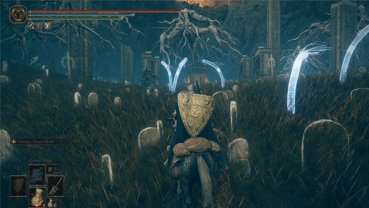 The Knight’s deadliest combo is his weapon’s unique skill. He’ll raise his sword and emit a vertical arc of moonlight; if you’re close enough, he’ll quickly follow up with a strong horizontal sword slash that might knock you down. A sideways dodge gets you safely away from the moonbeam, and another or a forward roll should keep the follow-up from harming you. That second strike has a wider reach, so it might take some practice to get the timing right.