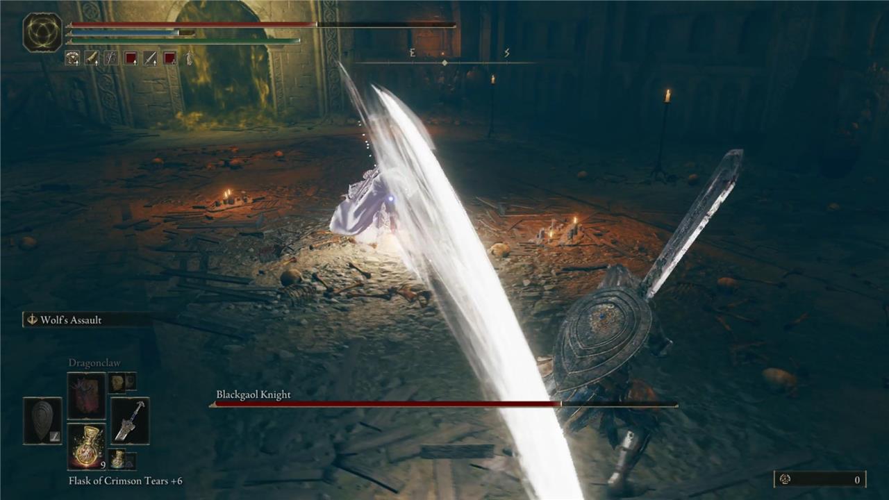 Like most human enemies, the Blackgaol Knight has one phase and one set of attacks that changes very little as the battle progresses. His most common combo is an overhead strike with his sword, followed by a horizontal slash. Roll sideways to avoid the former and backward to get away from the latter. You could also roll forward and hit him from behind if you’re really quick.
