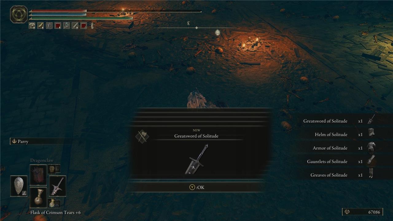 Victory against the Blackgaol Knight earns you the Greatsword of Solitude – complete with the same moon arc skill and follow-up slash the Knight used – and his armor: a set of heavy equipment that, if you have the stats to manage the load, goes a long way toward keeping you safe in the Land of Shadow.