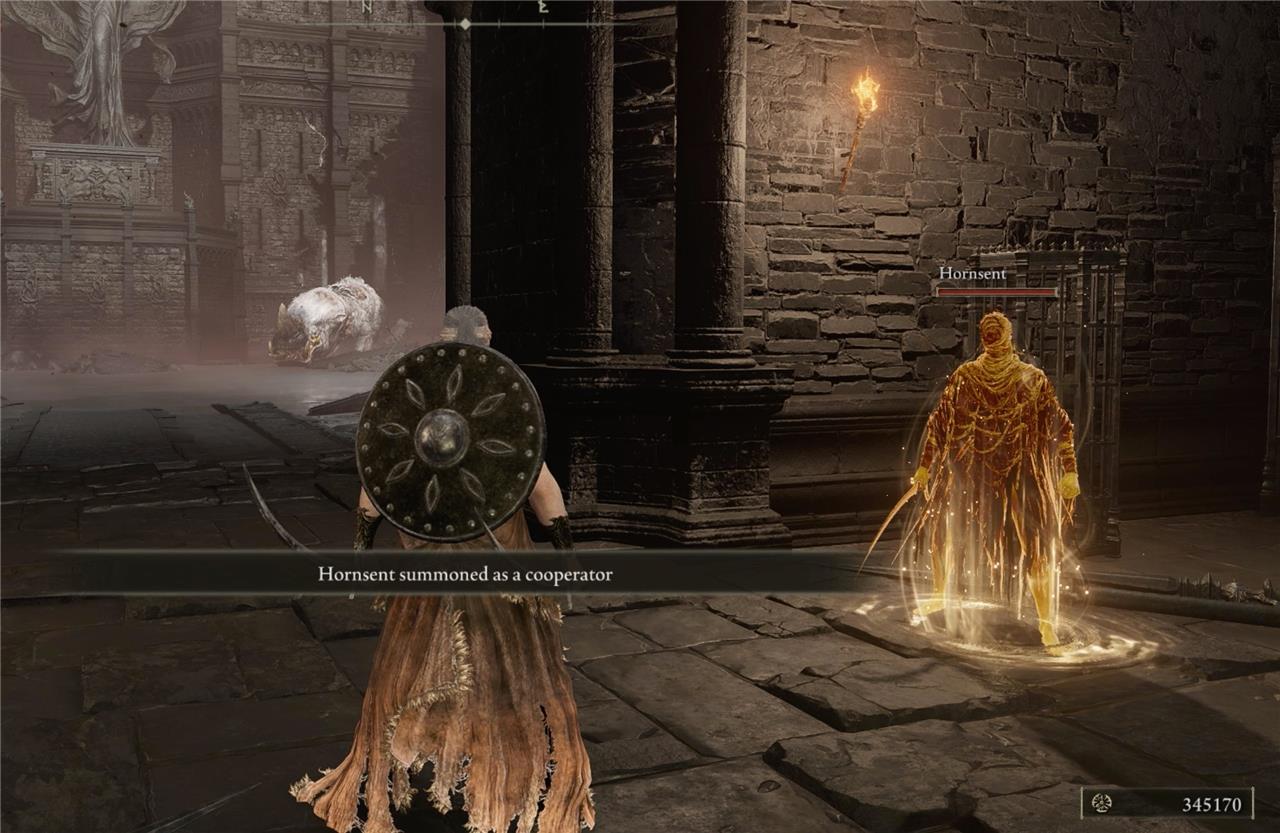 Head back to the Shadow Keep Main Gate Site of Grace. This time, there will be a gold summon sign to the right of the door. Summon Hornsent to help you with the Golden Hippopotamus boss fight.