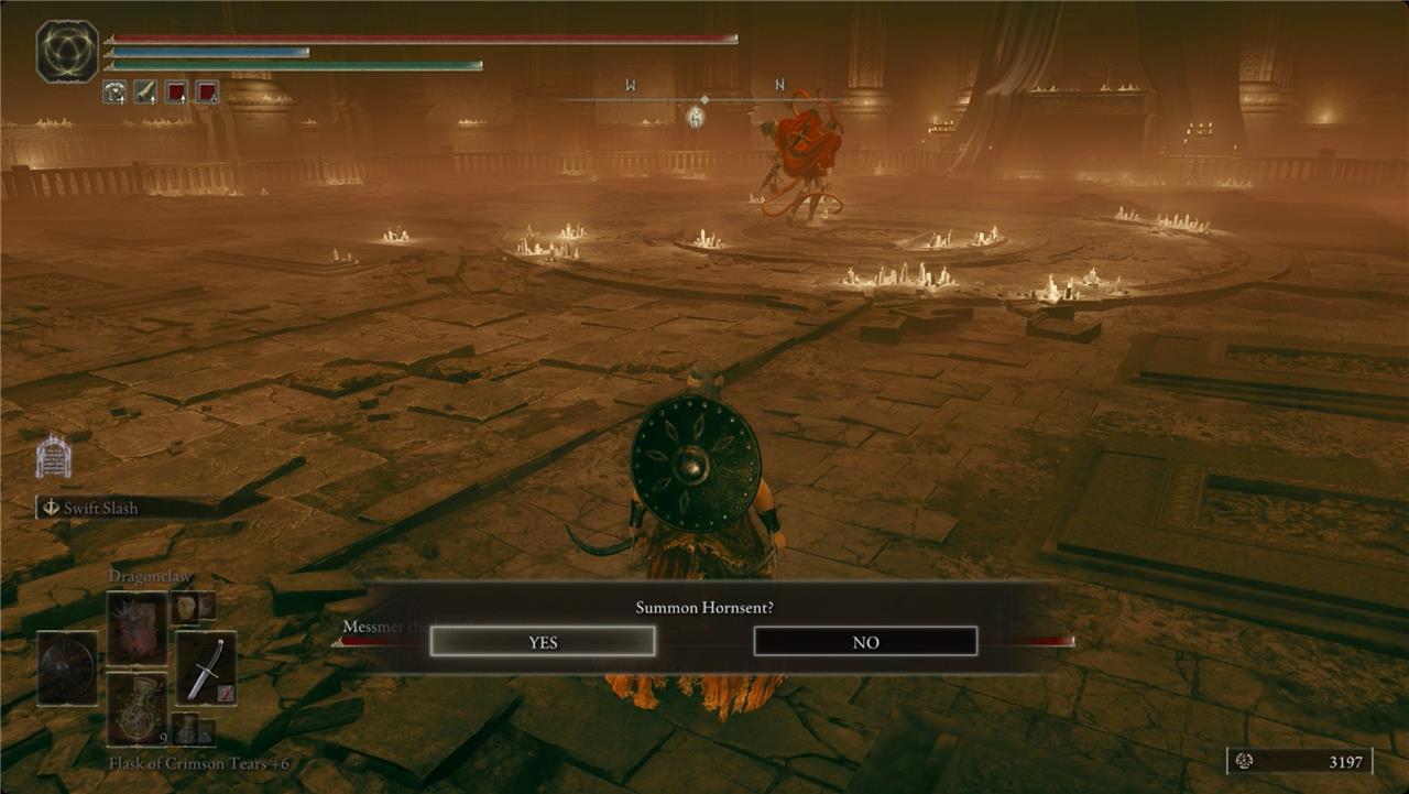 Before facing Messmer the Impaler in Elden Ring: Shadow of the Erdtree, you can summon Hornsent to assist you in the boss fight. To do this, after entering the boss arena from the Dark Chamber Entrance Site of Grace and watching the cutscene, look on the ground a bit forward and to the right for Hornsent’s gold summon sign. Summoning Hornsent is beneficial because he deals damage that Messmer is neutral to, can inflict Blood Loss, and his presence does not count towards your summon limit, meaning it won’t reduce your health bar. Hornsent will immediately join the fight upon summoning, helping to chip away at Messmer’s health and making the battle more manageable. Even if Hornsent falls during the fight, you can still progress his questline by talking to him after defeating Messmer at the grace that appears post-battle.