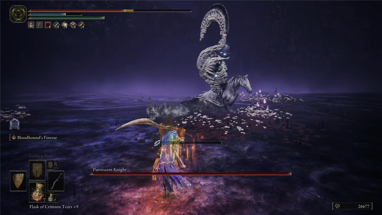 When it comes to building up Bleed, give preference to weapons capable of quick sequences of attacks, like katanas and twinblades. As mentioned, the windows to hit the Putrescent Knight are very short and you want to trigger blood loss as quickly as possible before the boss rides away from you.