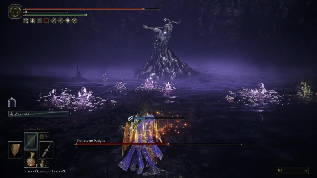 In general, the Putrescent Knight fight is not a fun experience for melee builds, since the boss moves a lot around the arena, giving you only a short window to land one or two hits. Long-range abilities, from sorceries to incantations, can work well against this enemy.