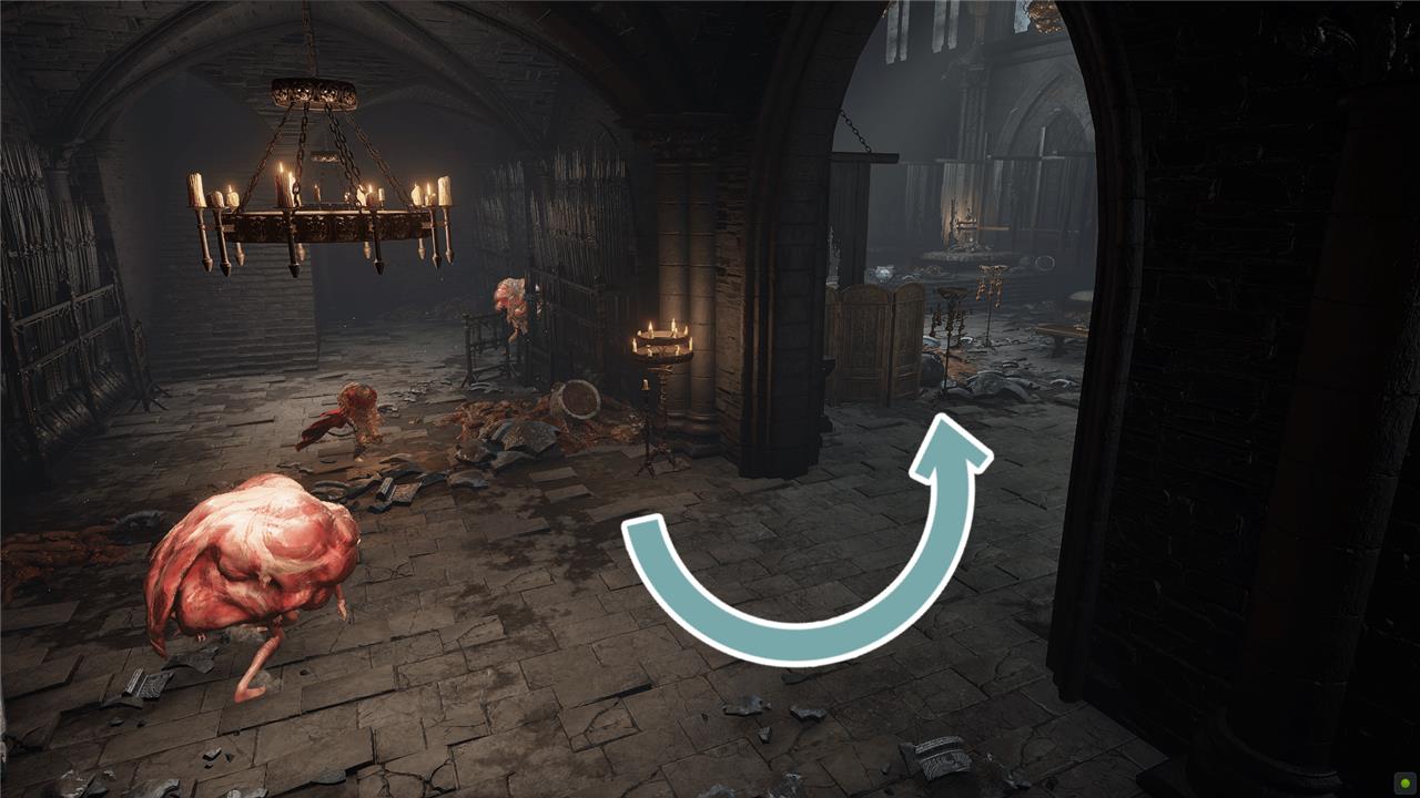 Head back out and take the first left. A Those Who Live in Death will jump out at you. Keep going straight and deal with another Those Who Live in Death. The hall ahead of you splits. The left side looks like a dead end, but it’s actually an illusory wall. Roll against it to pass through and collect the Battlefield Priest’s Cookbook (4).