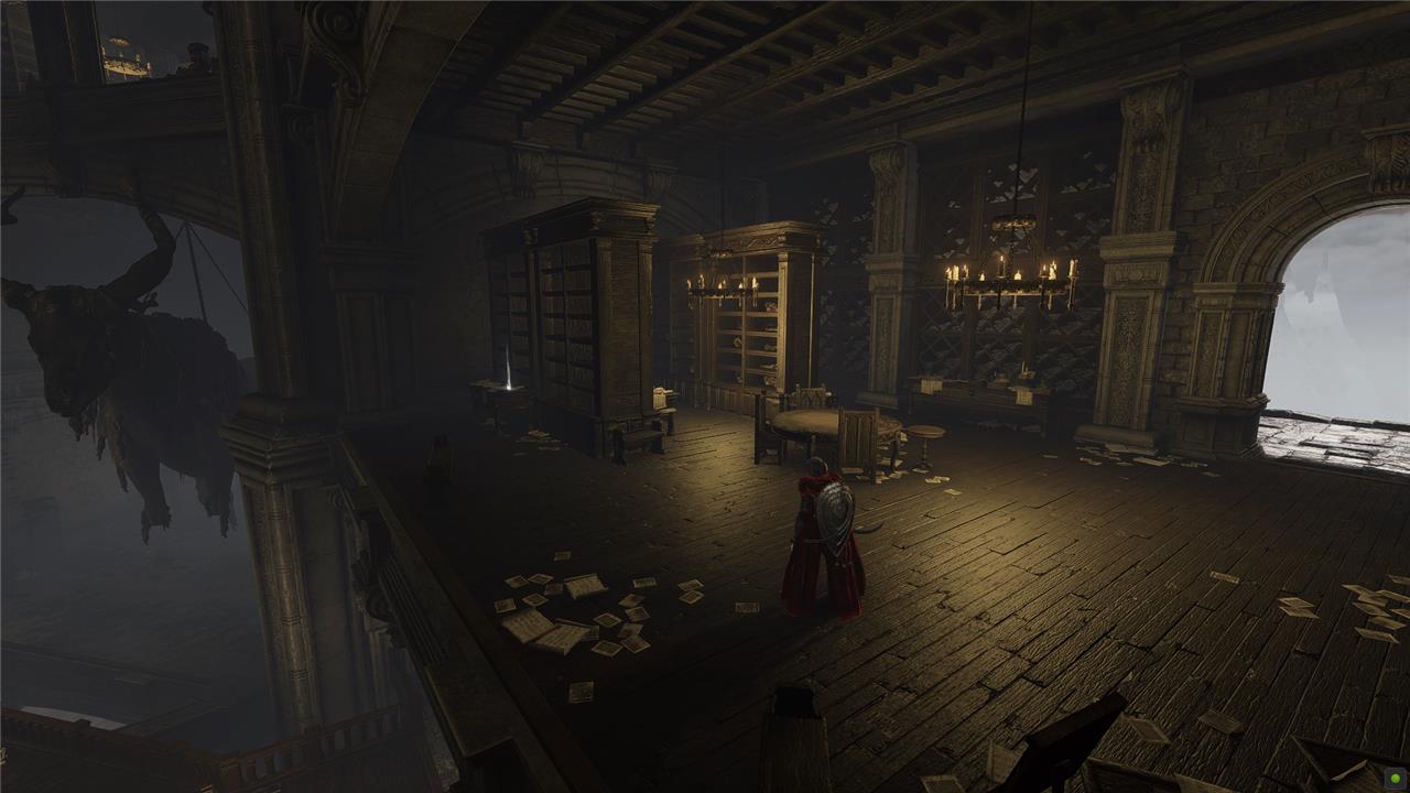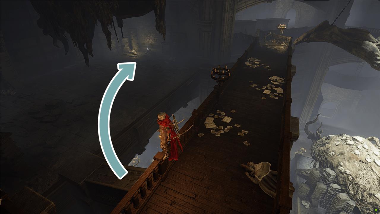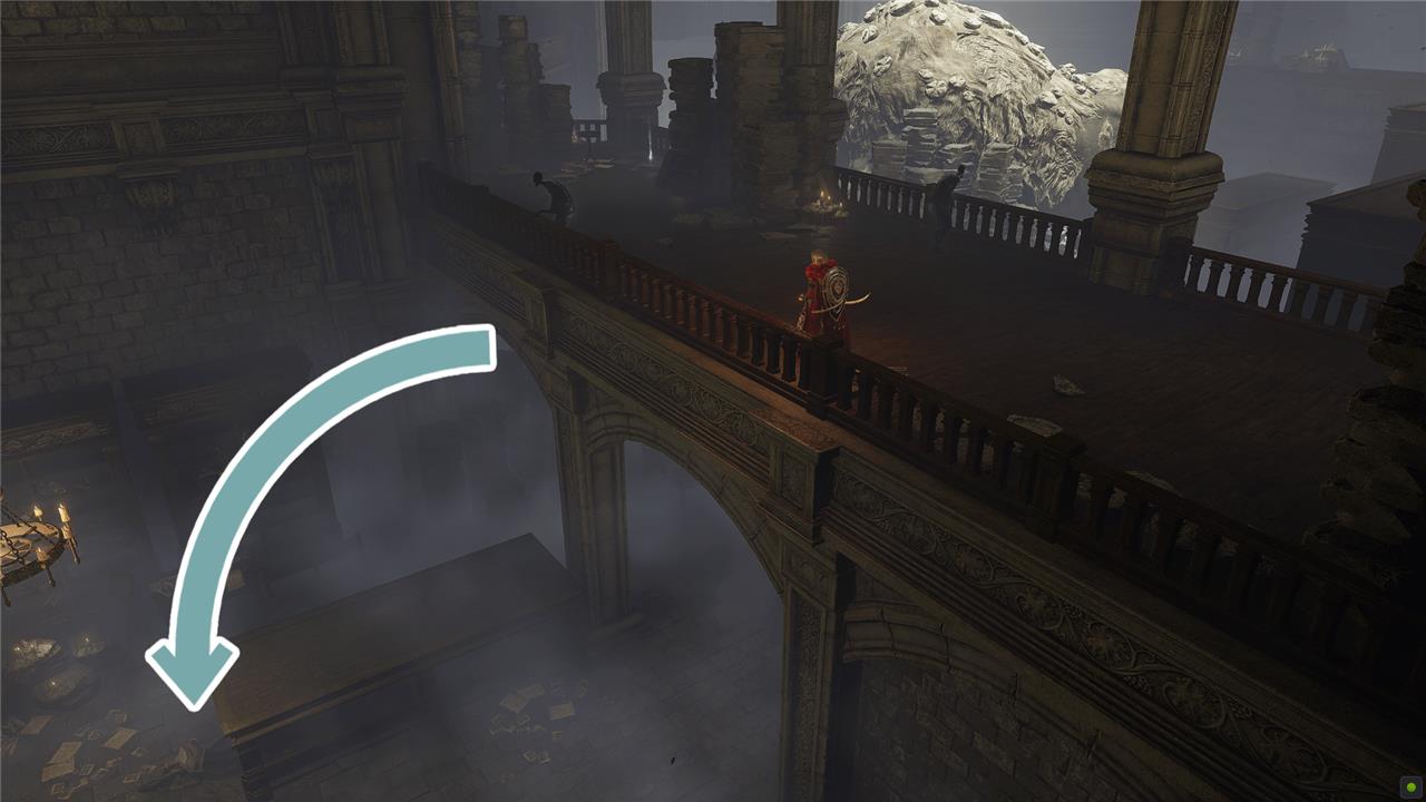 Starting at the top of the stairs, head over to the right and follow the walkway around. Below you on the left, you’ll see an open room with large tables. Jump the railing and drop down to find the Boltdrake Talisman 3.