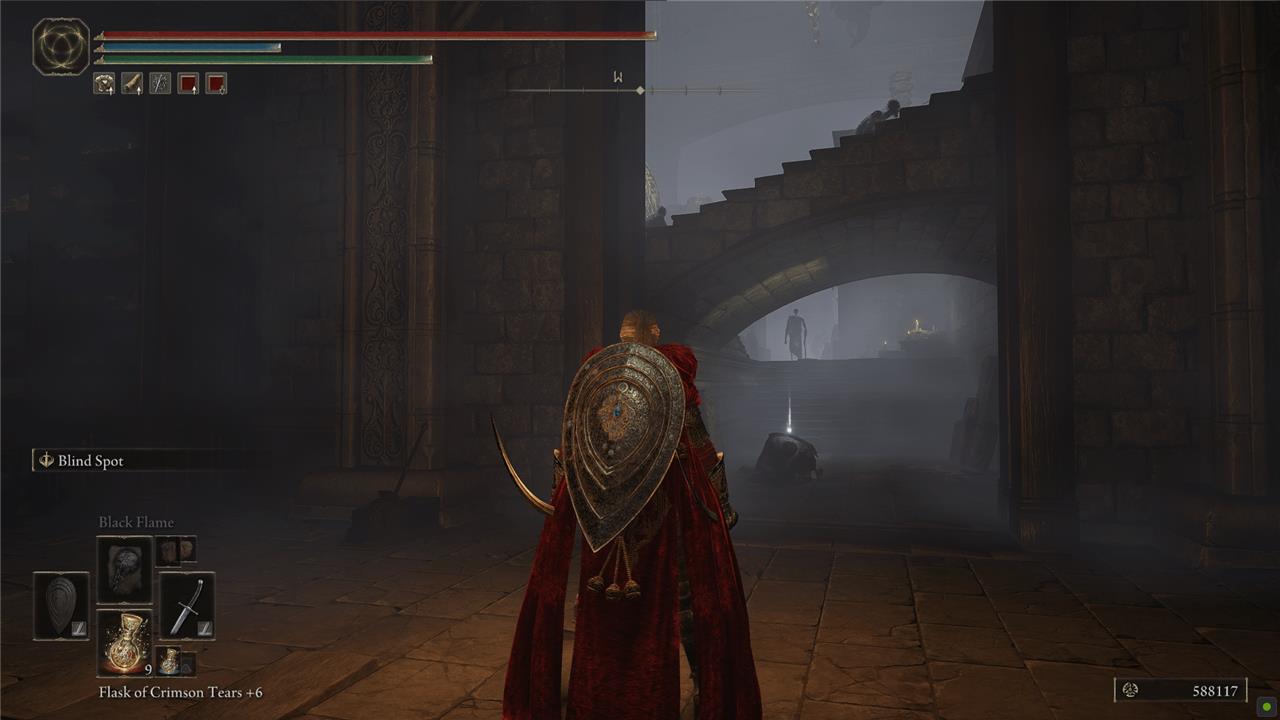 There are two Black Knights in the hall at the top of the stairs – one with a greatbow (and a twinblade) directly ahead of you, and a sneaky one just to the left of the door. If you’re careful, you can kite the sword-and-shield one back down the stairs to fight him without getting shot constantly. Once they’re both dealt with, grab the Golden Vow consumable and the Shadow Realm Rune (6).