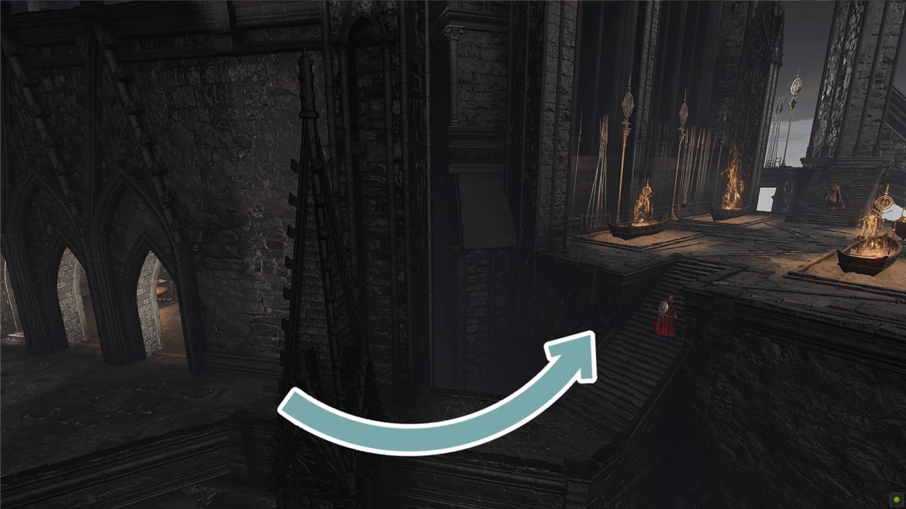 Turn left and head up the stairs to find the Dark Chamber EntranceSite of Grace.