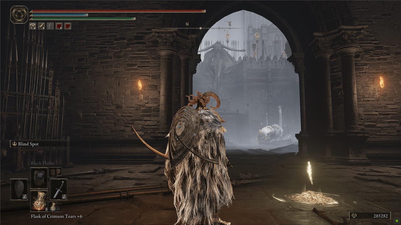 Back at the center of the rampart (and the top of the ramp), turn north. Cross the bridge to meet your first Fire Knight. Continue into the castle and ride the elevator up. At the top, you’ll find the Storehouse, First Floor Site of Grace.