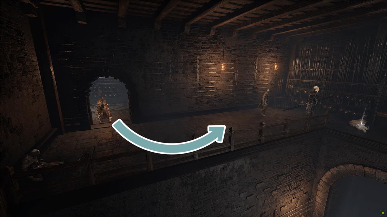 At the bottom, take the first left. Grab the Ash of War: Wall of Sparks from the corpse on the railing, and then head back into the hall.