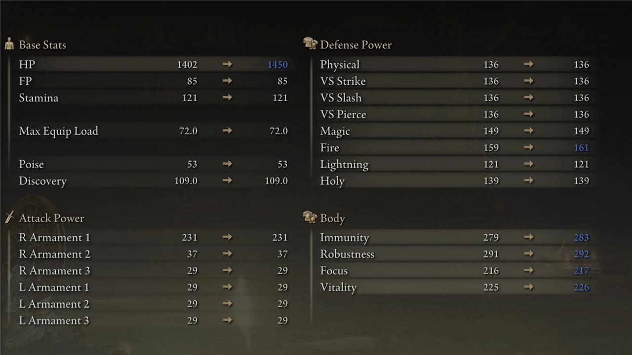 • If you level your Vigor from level 3 to level 4, your HP will increase from 312 to 322.