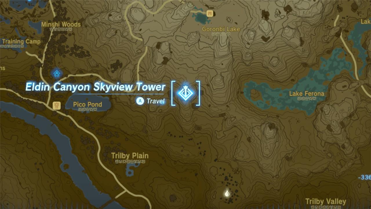Head to the Eldin Canyon Skyview Tower northeast of Lookout Landing at coordinates 1636, 1183, 0226. Talk to Sawson at the locked entrance to learn a falling rock knocked off the roof. Wait for rubble to drop from above, stand on it, activate Recall to ride it skyward, then leap off and paraglide through the open top. Drop inside, claim the shrine, and step on the launch pad to reveal the regional map.โ